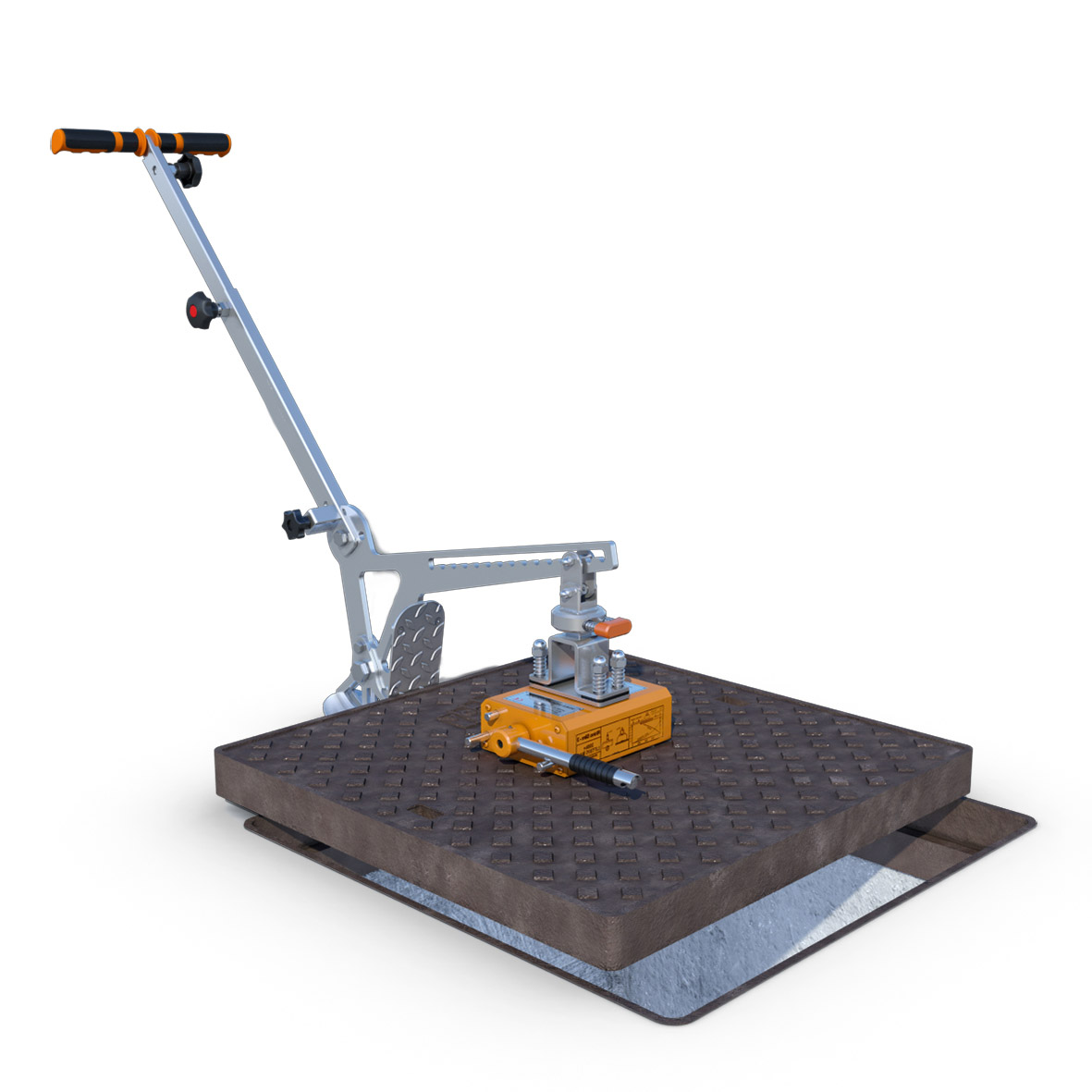 Apri chiusini universale con tripla piastra magnetica mobile, ideale per chiusini lineari, curvi o con superfici dissestate. La nuova piastra magnetica garantisce un’ottimizzazione del contatto magnetico e una maggiore forza di adesione.